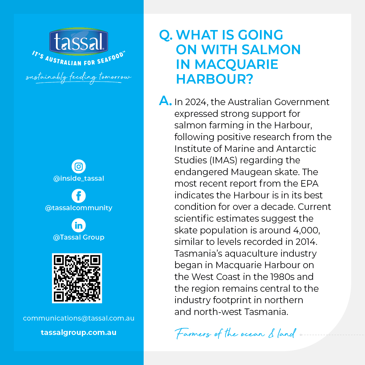 In 2024, the Australian Government expressed strong support for salmon farming in the Harbour, following positive research from the Institute of Marine and Antarctic Studies (IMAS) regarding the endangered Maugean skate. The most recent report from the EPA indicates the Harbour is in its best condition for over a decade. Current scientific estimates suggest the skate population is around 4,000, similar to levels recorded in 2014. Tasmania’s aquaculture industry began in Macquarie Harbour on the West Coast in the 1980s and the region remains central to the industry footprint in northern and north-west Tasmania.