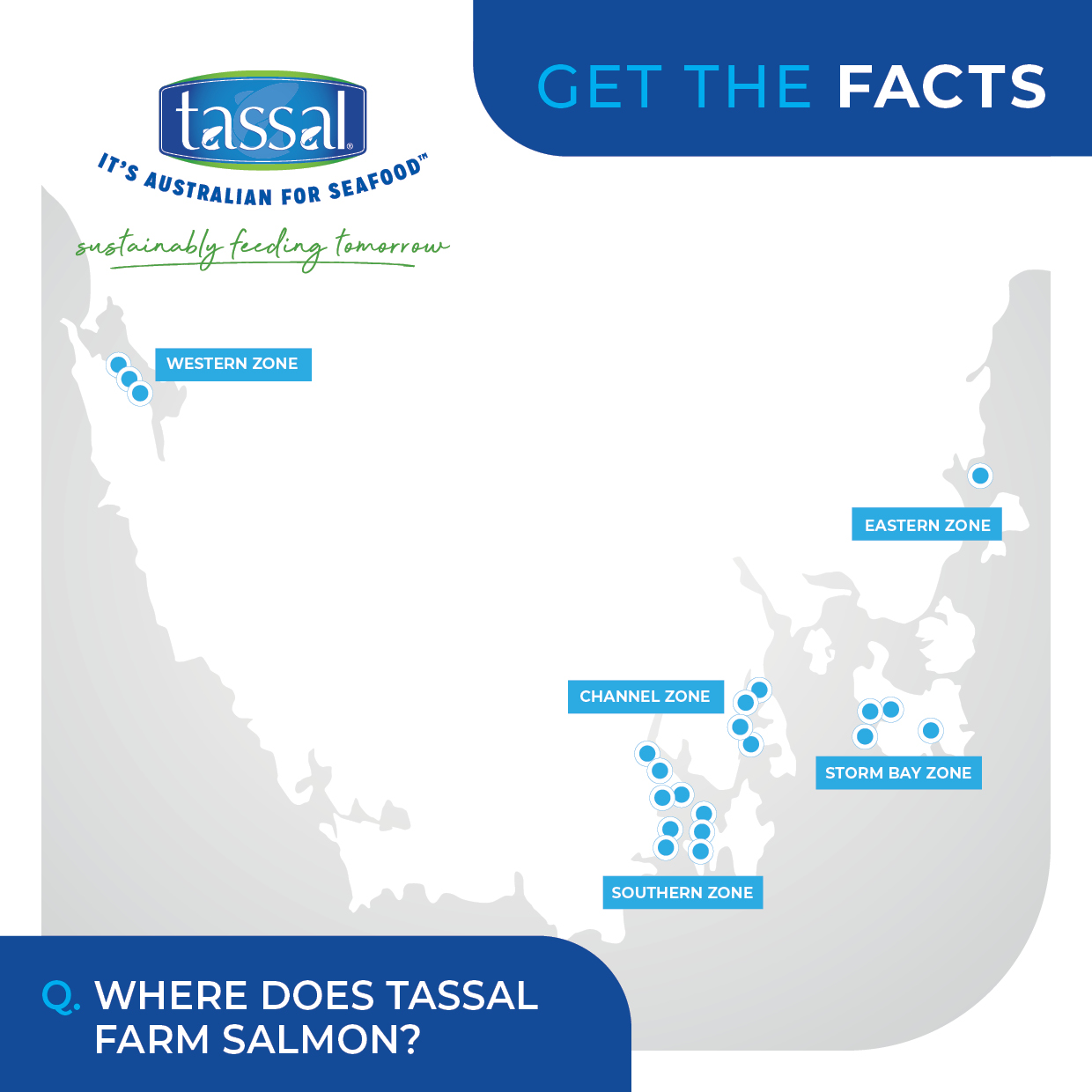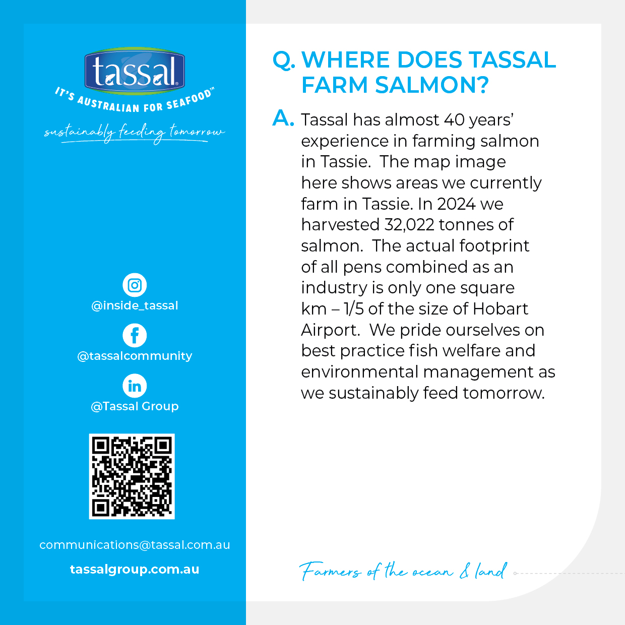 Tassal has almost 40 years’ experience in farming salmon in Tassie. The map image here shows areas we currently farm in Tassie. In 2024 we harvested 32,022 tonnes of salmon. The actual footprint of all pens combined as an industry is only one square km – 1/5 of the size of Hobart Airport. We pride ourselves on best practice fish welfare and environmental management as we sustainably feed tomorrow.