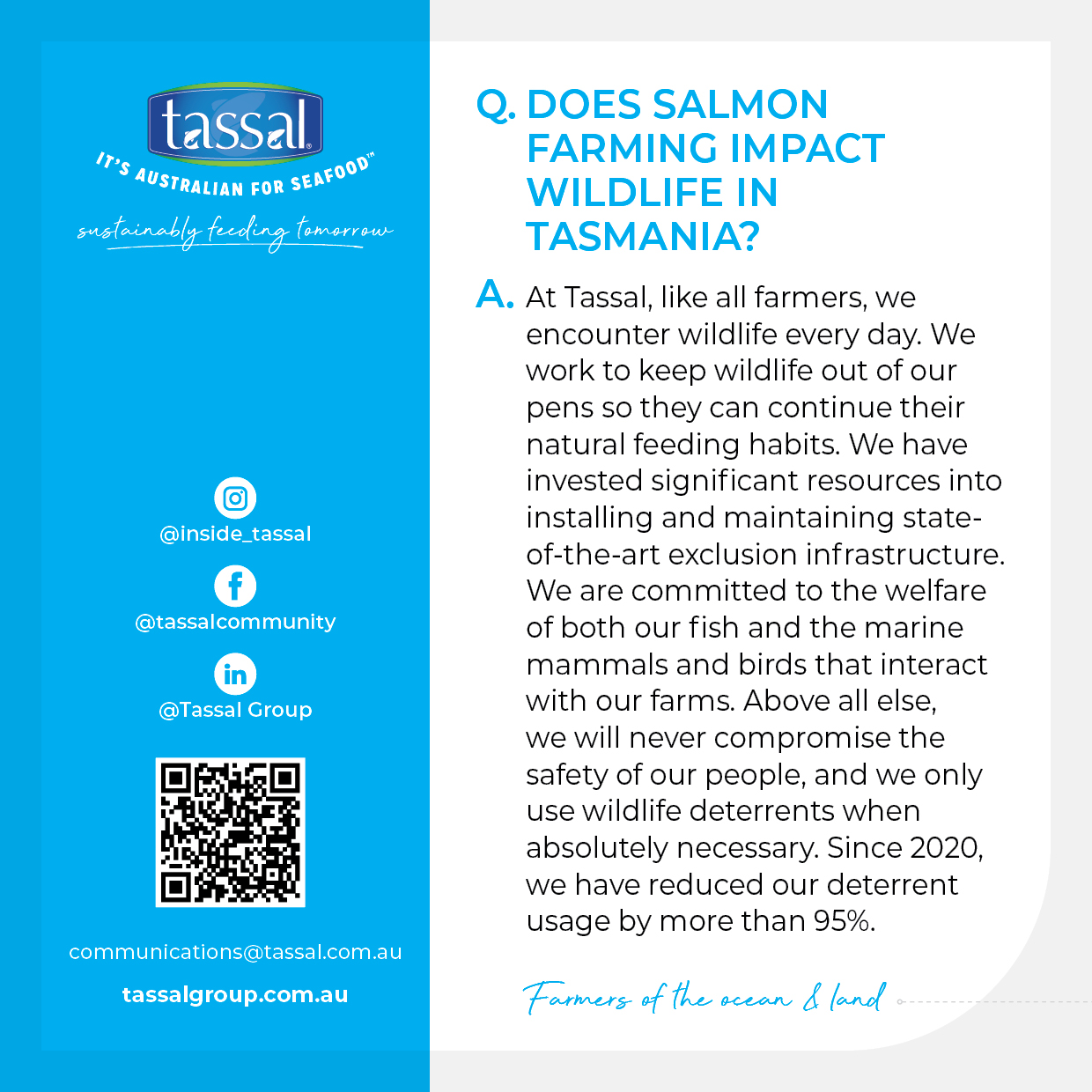At Tassal, like all farmers, we encounter wildlife every day. We work to keep wildlife out of our pens so they can continue their natural feeding habits. We have invested significant resources into installing and maintaining stateof-the-art exclusion infrastructure. We are committed to the welfare of both our fish and the marine mammals and birds that interact with our farms. Above all else, we will never compromise the safety of our people, and we only use wildlife deterrents when absolutely necessary. Since 2020, we have reduced our deterrent usage by more than 95%.