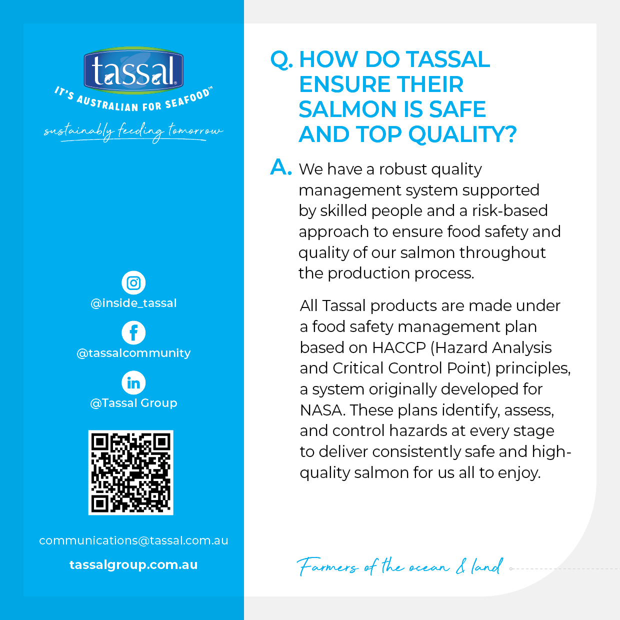 We have a robust quality management system supported by skilled people and a risk-based approach to ensure food safety and quality of our salmon throughout the production process. All Tassal products are made under a food safety management plan based on HACCP (Hazard Analysis and Critical Control Point) principles, a system originally developed for NASA. These plans identify, assess, and control hazards at every stage to deliver consistently safe and highquality salmon for us all to enjoy.
