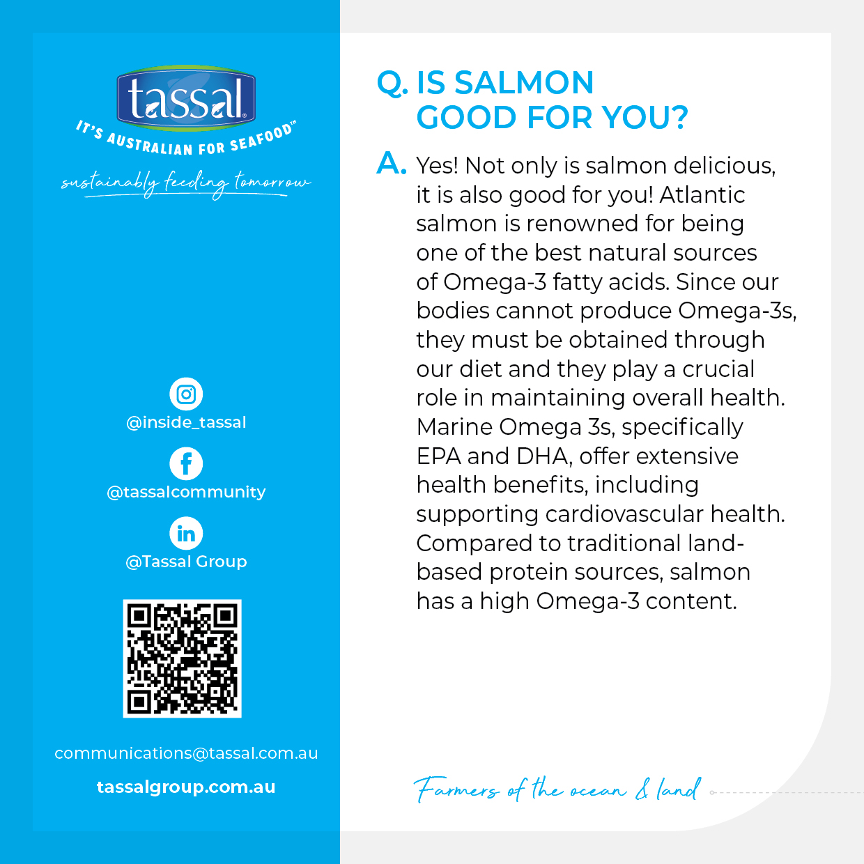 Yes! Not only is salmon delicious, it is also good for you! Atlantic salmon is renowned for being one of the best natural sources of Omega-3 fatty acids. Since our bodies cannot produce Omega-3s, they must be obtained through our diet and they play a crucial role in maintaining overall health. Marine Omega 3s, specifically EPA and DHA, offer extensive health benefits, including supporting cardiovascular health. Compared to traditional landbased protein sources, salmon has a high Omega-3 content.