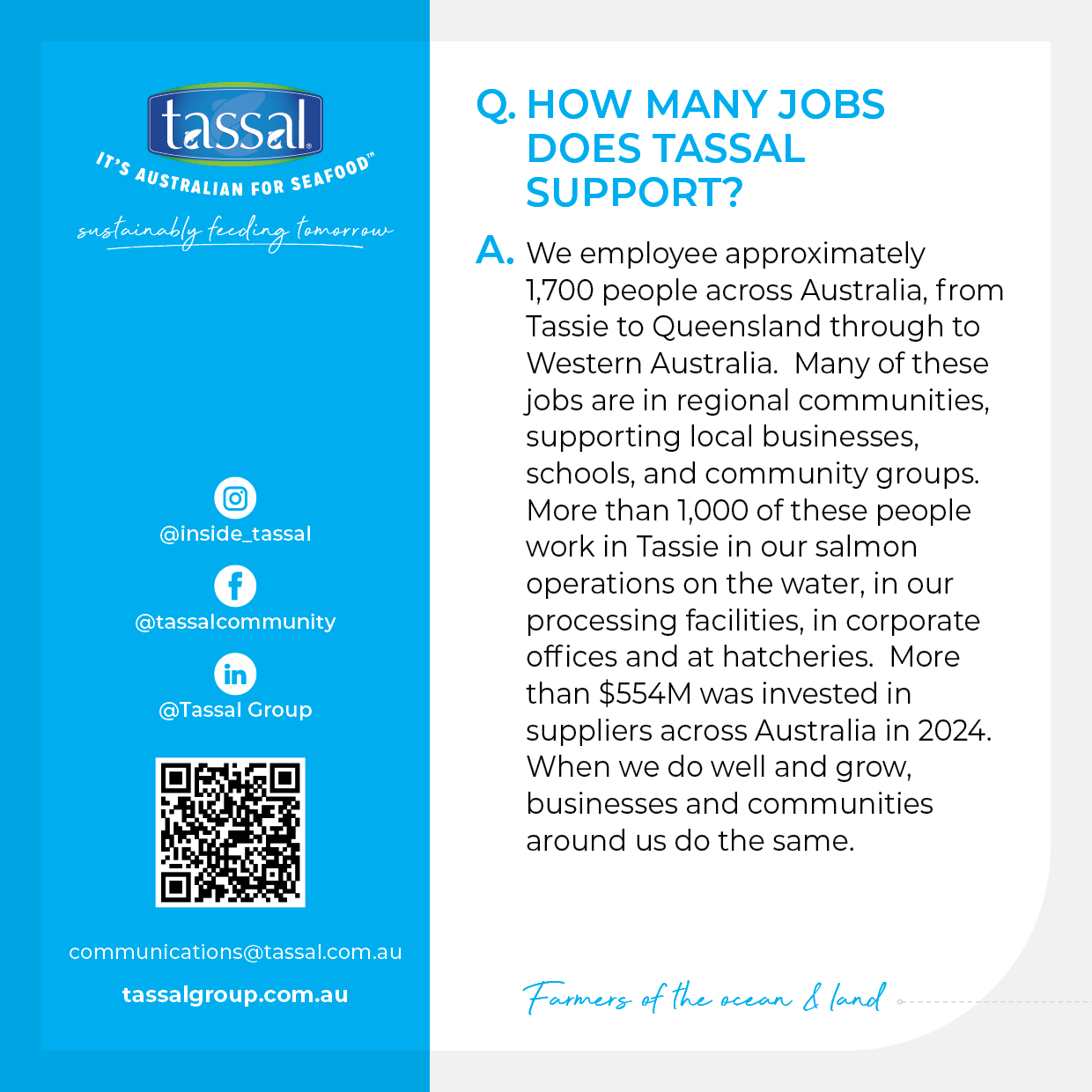 We employee approximately 1,700 people across Australia, from Tassie to Queensland through to Western Australia. Many of these jobs are in regional communities, supporting local businesses, schools, and community groups. More than 1,000 of these people work in Tassie in our salmon operations on the water, in our processing facilities, in corporate offices and at hatcheries. More than $554M was invested in suppliers across Australia in 2024. When we do well and grow, businesses and communities around us do the same.